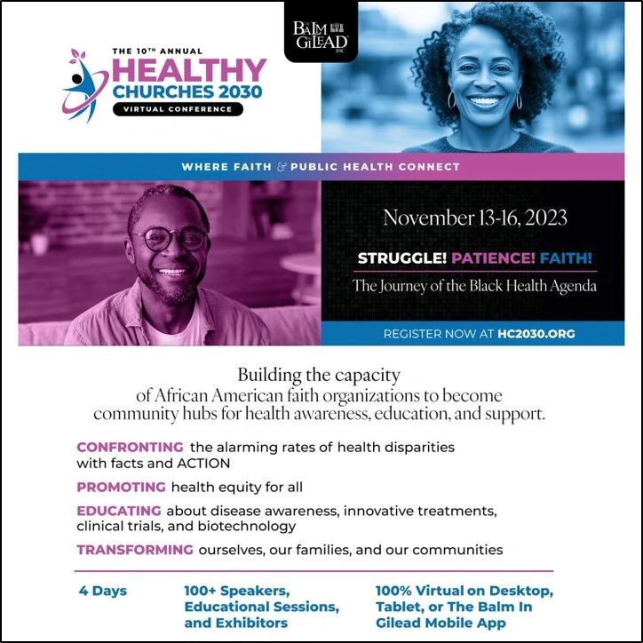 Faith Tabernacle is excited to partner with the Balm in Gilead, Inc. for their 10th Annual Healthy Churches Virtual Conference starting Monday, Nov. 13-16th.